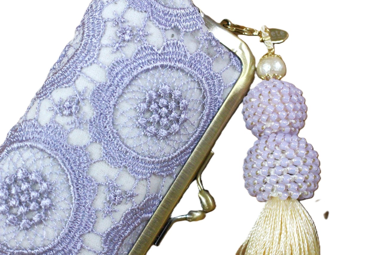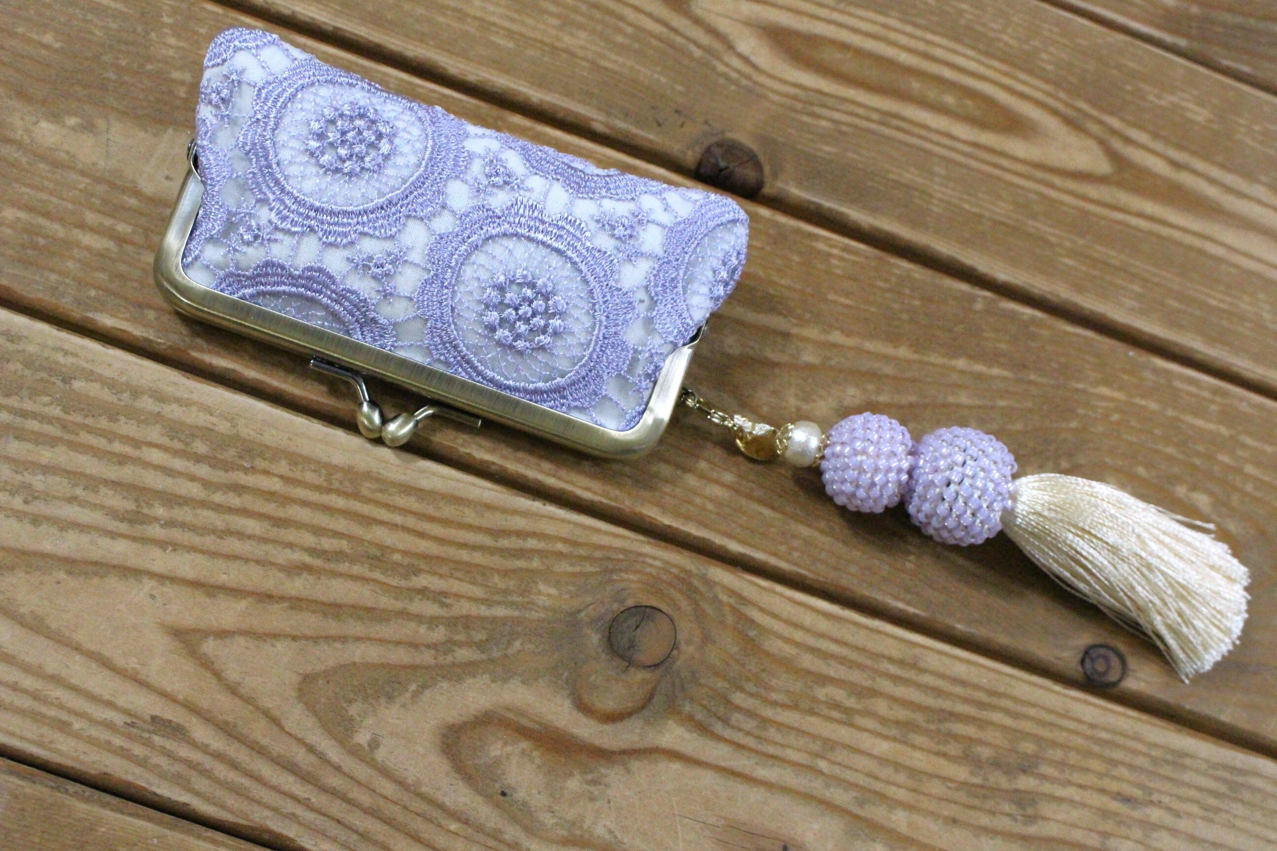 【はこせこボンボン】【はこせこタイプの帯飾り】【根付】【ミニがまタイプ】レース/ライラック