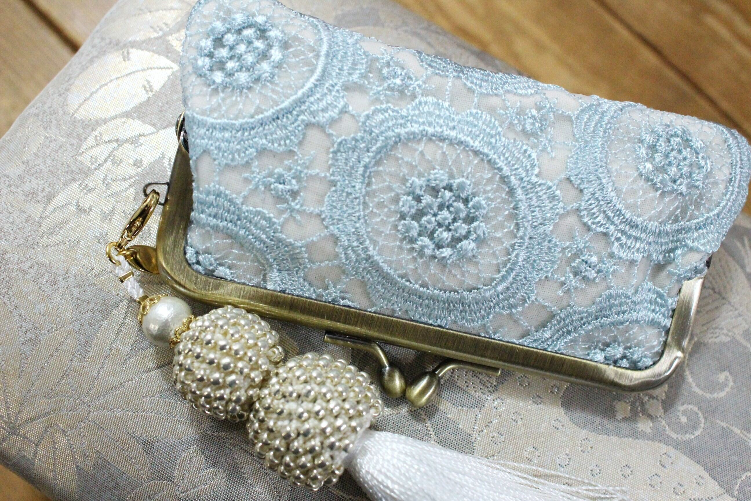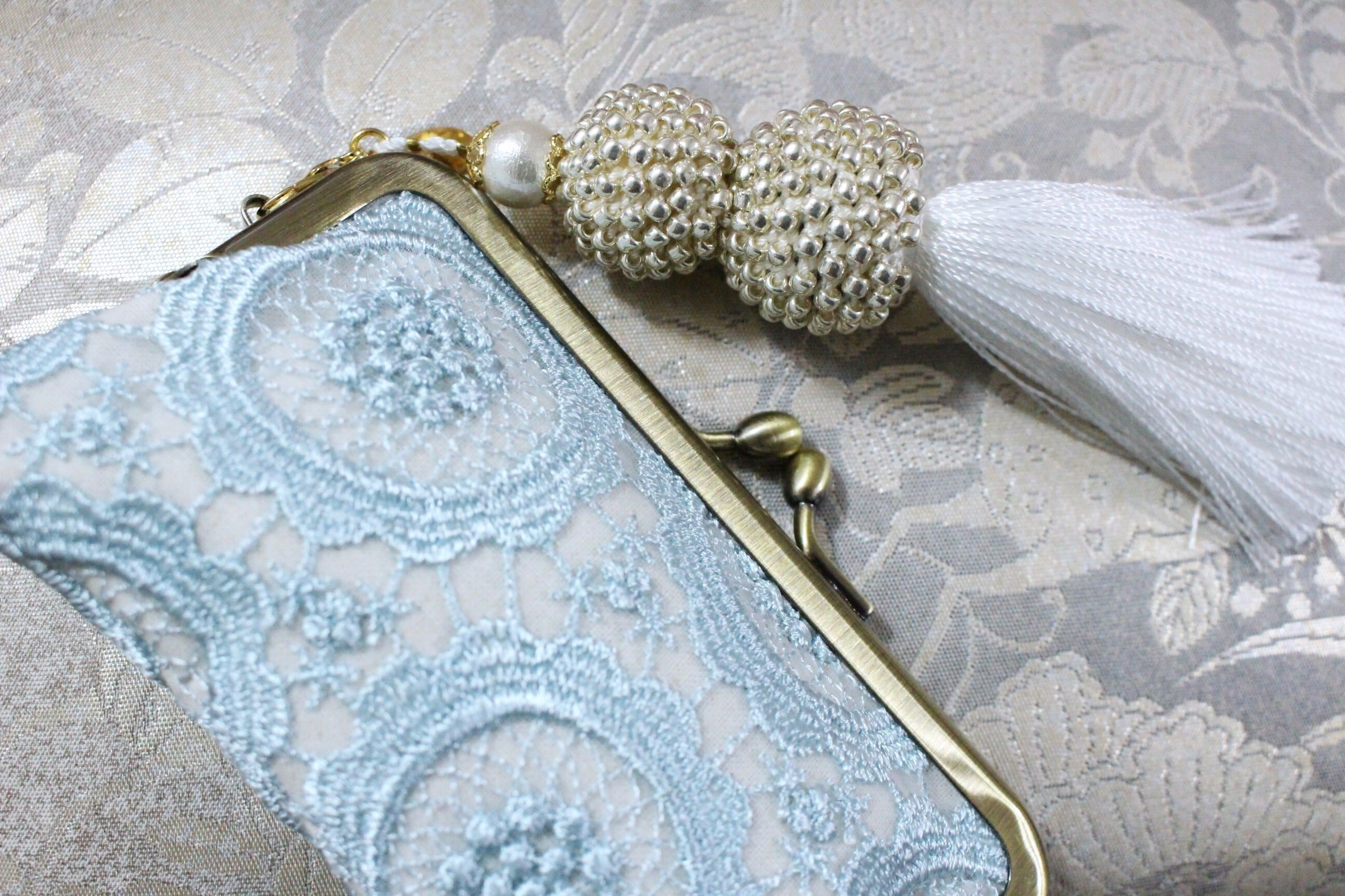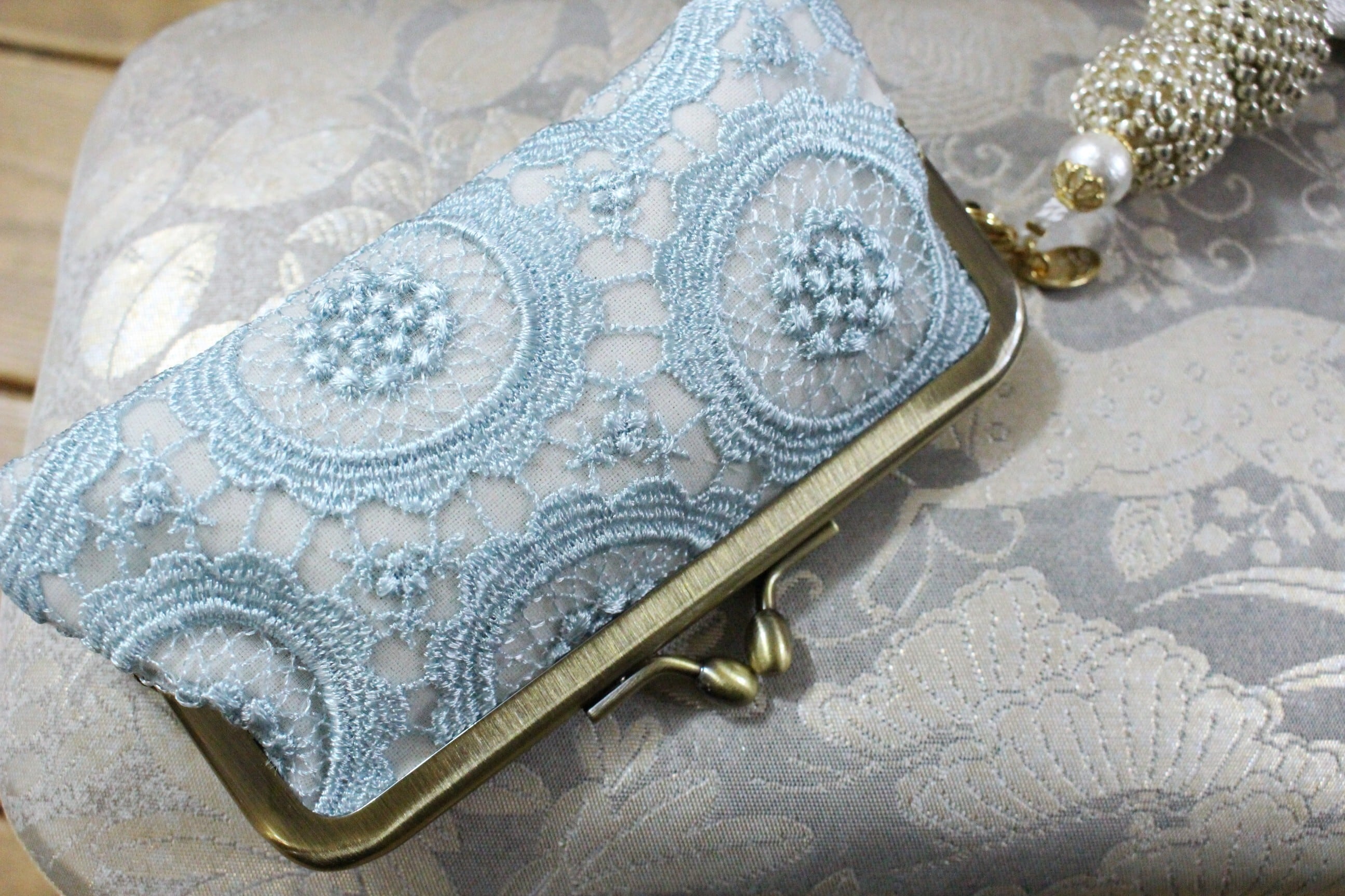 【はこせこボンボン】【はこせこタイプの帯飾り】【根付】【ミニがまタイプ】レース/水色
