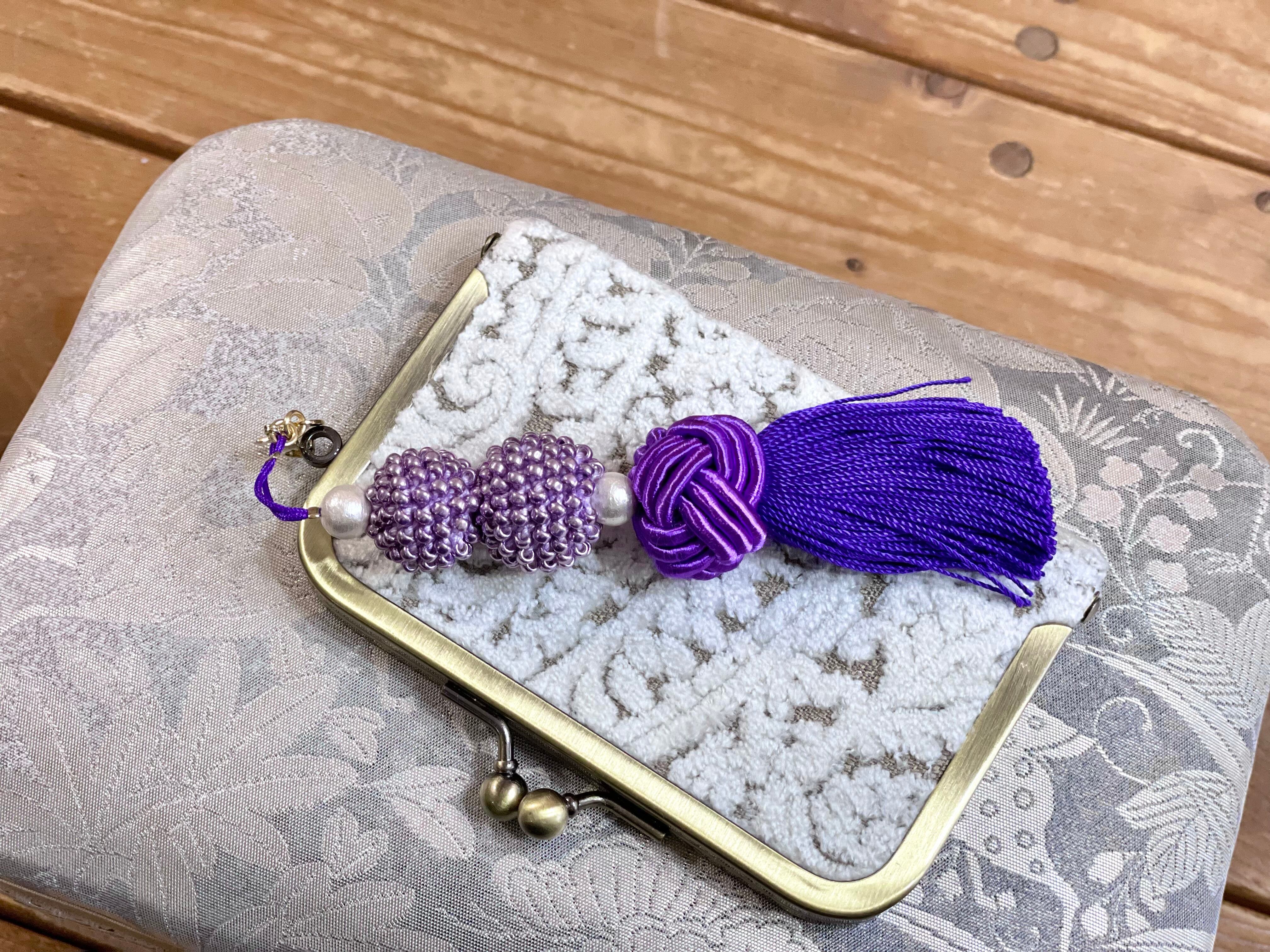 帯にすっと差し込むタイプのがま口にボンボンタッセルの可愛い帯飾り(根付)です。カードタイプのがま口ですのでICカードを収納すれば鞄から出す必要もなくなりますね、カード数枚に三つ折りに畳んだお札も入ります。ボリューミーなボンボンの根付も根付板ではなく、このはこせこタイプのがま口ならしっかりと帯に挟まって、安心です。気が付いたらない!!!というような紛失も防げます。そして、実用性も又重要なポイントです。可愛くて便利な根付は帯周りを可憐に華やかに、着こなしのアクセントととして楽します。ベルギーから取り寄せた生地は華やかで、独特の美しい色合いにヨーロッパの香りががふわりと漂うような雰囲気を纏っていて魅力的です。ぜひこの機会をお見逃しなく。1点1点手仕事での制作です、若干の個体差があります旨ご了承くださいますようお願いいたします。
