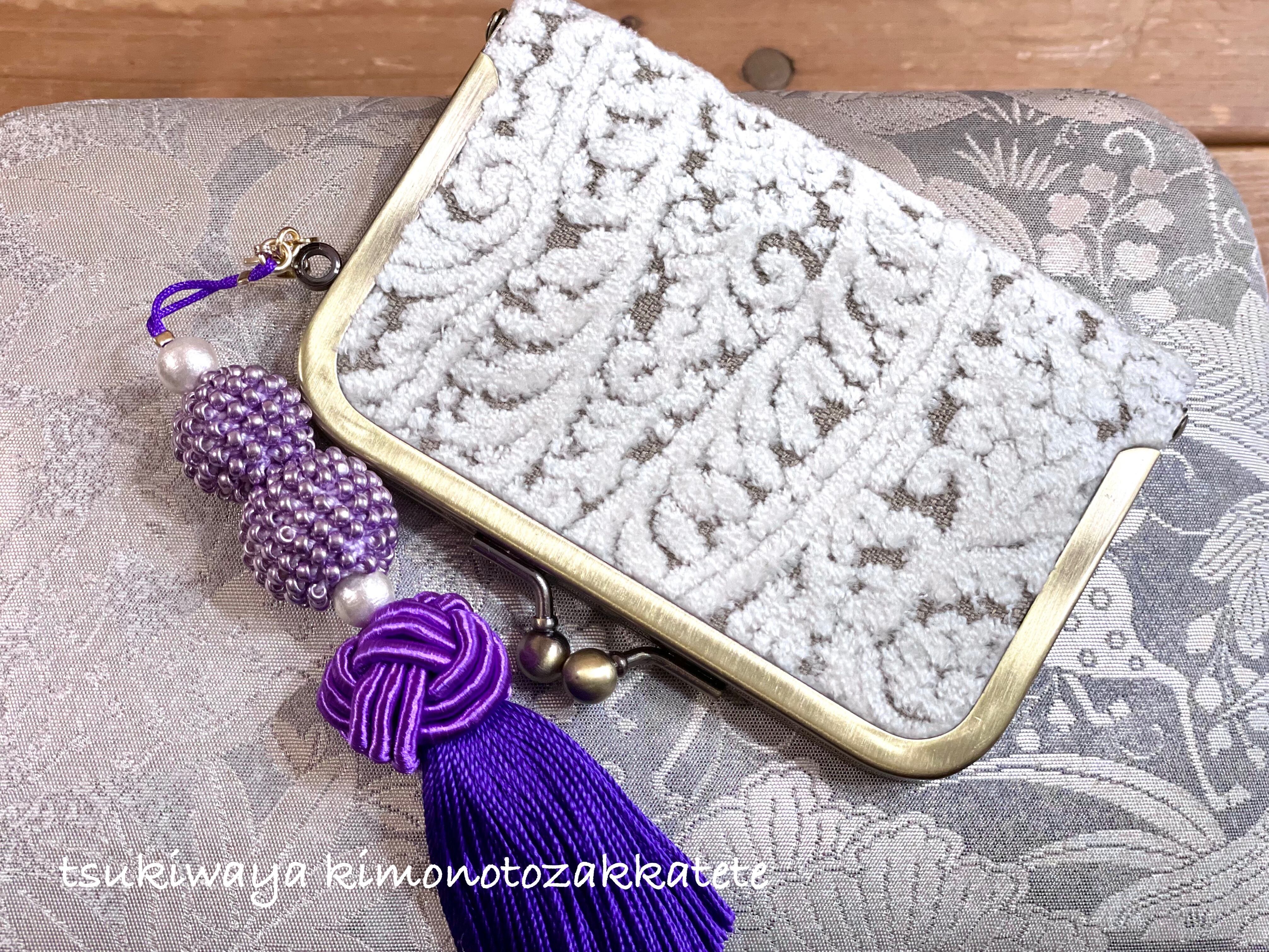 ベルギーから取り寄せてもらったダマスク調のベルベットを使って製作したカードタイプのがま口には、カードが数枚収納でき、内ポケットと仕切りがあります。カードや三つ折りのお札が収納できます。5色展開(ホワイト/水色/グレー/イエロー/レッド)です。