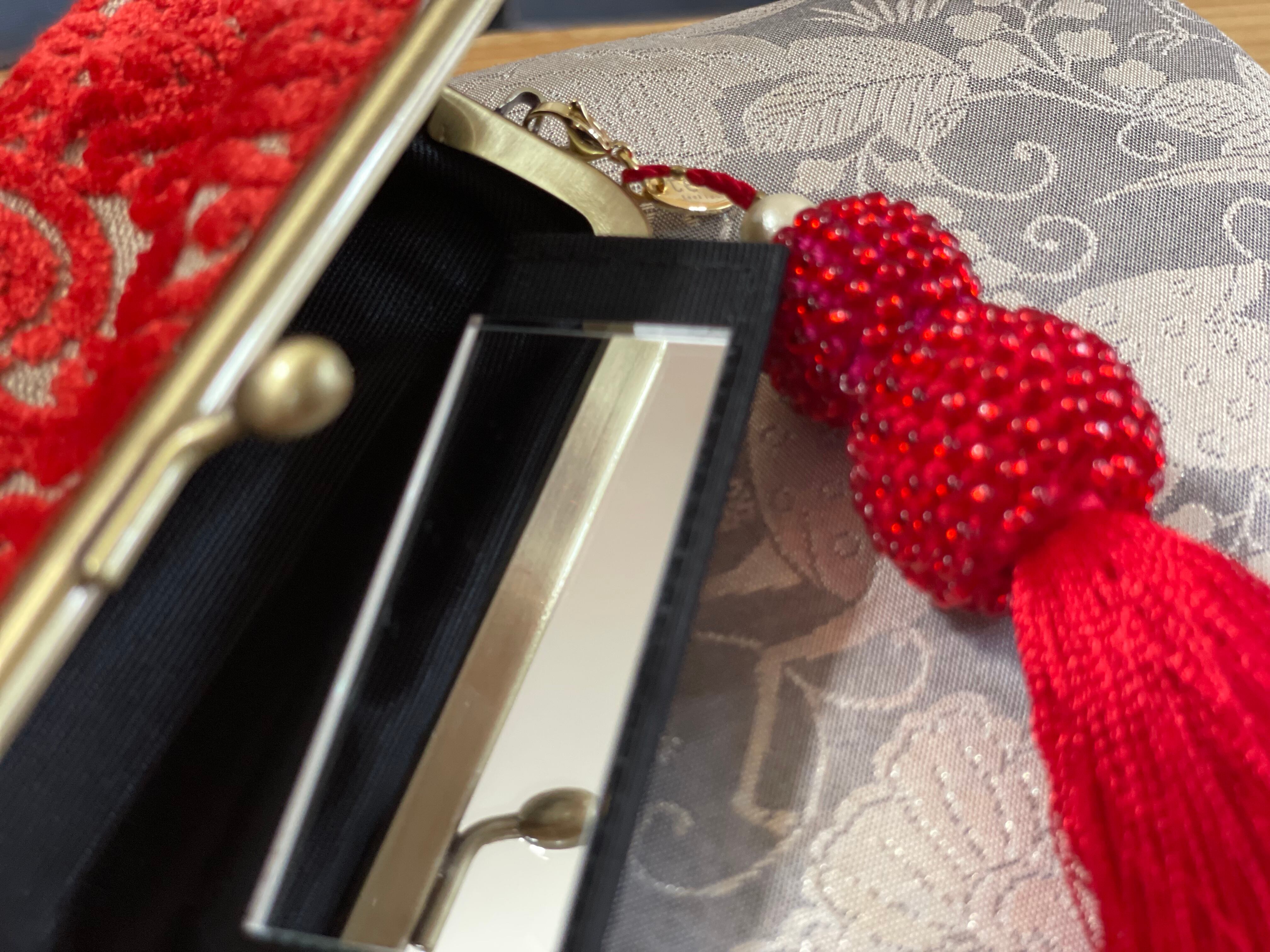 帯にすっと差し込むタイプの細長の小さながま口にボンボンタッセルの可愛い帯飾り(根付)です。細長タイプのがま口の中にはミラーがついていますのでリップケースとしても、鏡ちょっと見たい!という時にも便利。またカードが1枚と小銭や小さなアクセサリーやお薬などが入れらます。ボリューミーなボンボンの根付も根付板ではなく、この細長タイプのミニがま口ならしっかりと帯に挟まって、安心です。気が付いたらない!!!というような紛失も防げますね。そして、カードや小銭が入る実用性も又重要なポイントです。可愛くて便利な根付は帯周りを可憐に華やかに、着こなしのアクセントととして楽します。新シリーズのほこせこボンボン、ぜひこの機会をお見逃しなく。1点1点手仕事での制作です、若干の個体差があります旨ご了承くださいますようお願いいたします